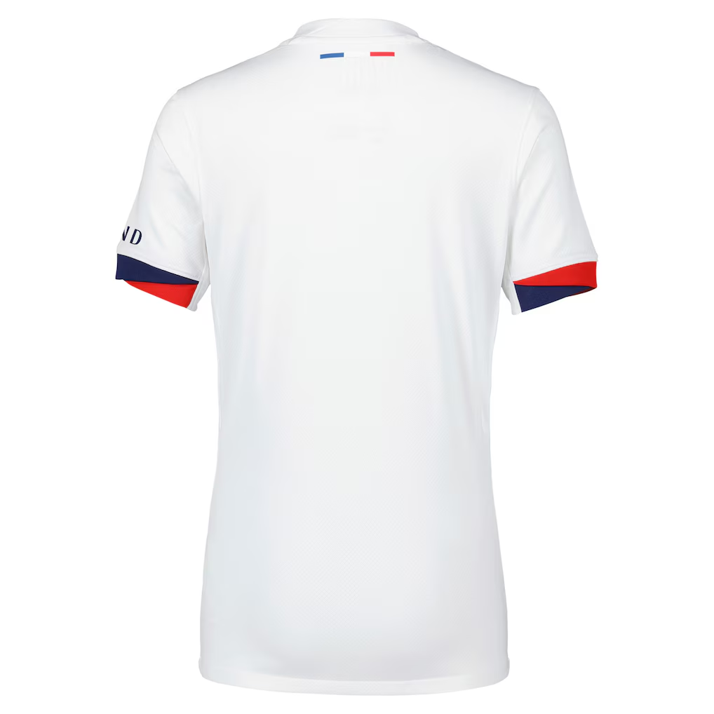 Entering the 2025/26 season as defending Ligue 1 and UEFA Champions League champions, Paris Saint-Germain carries the weight of history on their shoulders. This white away jersey will accompany Ousmane Dembélé, Khvicha Kvaratskhelia, Désiré Doué, and Vitinha as they defend Parisian glory on every front.