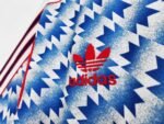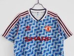 The 1991/1992 Manchester United away retro jersey features the iconic blue and white stripes with golden crest detailing. Worn by club legends like Mark Hughes and Bryan Robson, this vintage kit commemorates United’s final First Division campaign before the dawn of their Premier League dominance.